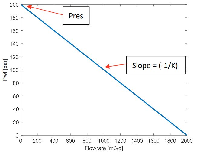In the IPR graph, the y-intercept represents the reservoir pressure when there is no flow. The negative slope (\(K\)) is also known as the Productivity Index (\(PI\)), is the ratio between flowrate and well drawdown.