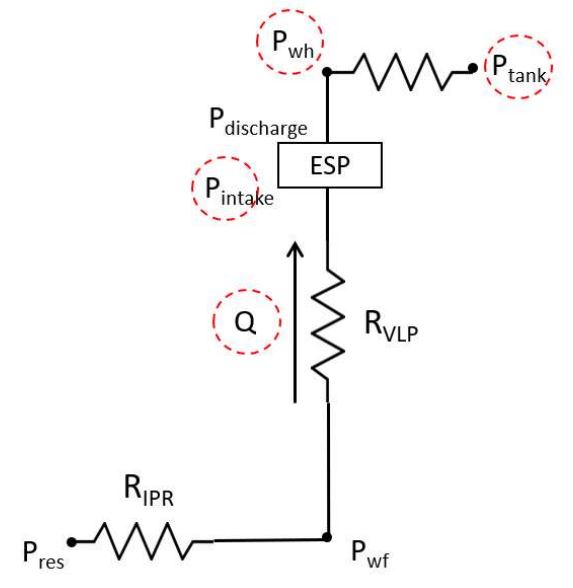 For systems without ESP, use well head pressure (\(P_{wh}\)) as the topside boundary condition. If the wellhead pressure is unavailable, tank pressure or pipeline pressure with additional pressure drop can be used. For systems with ESP, use the intake pressure as boundary condition for nodal analysis.