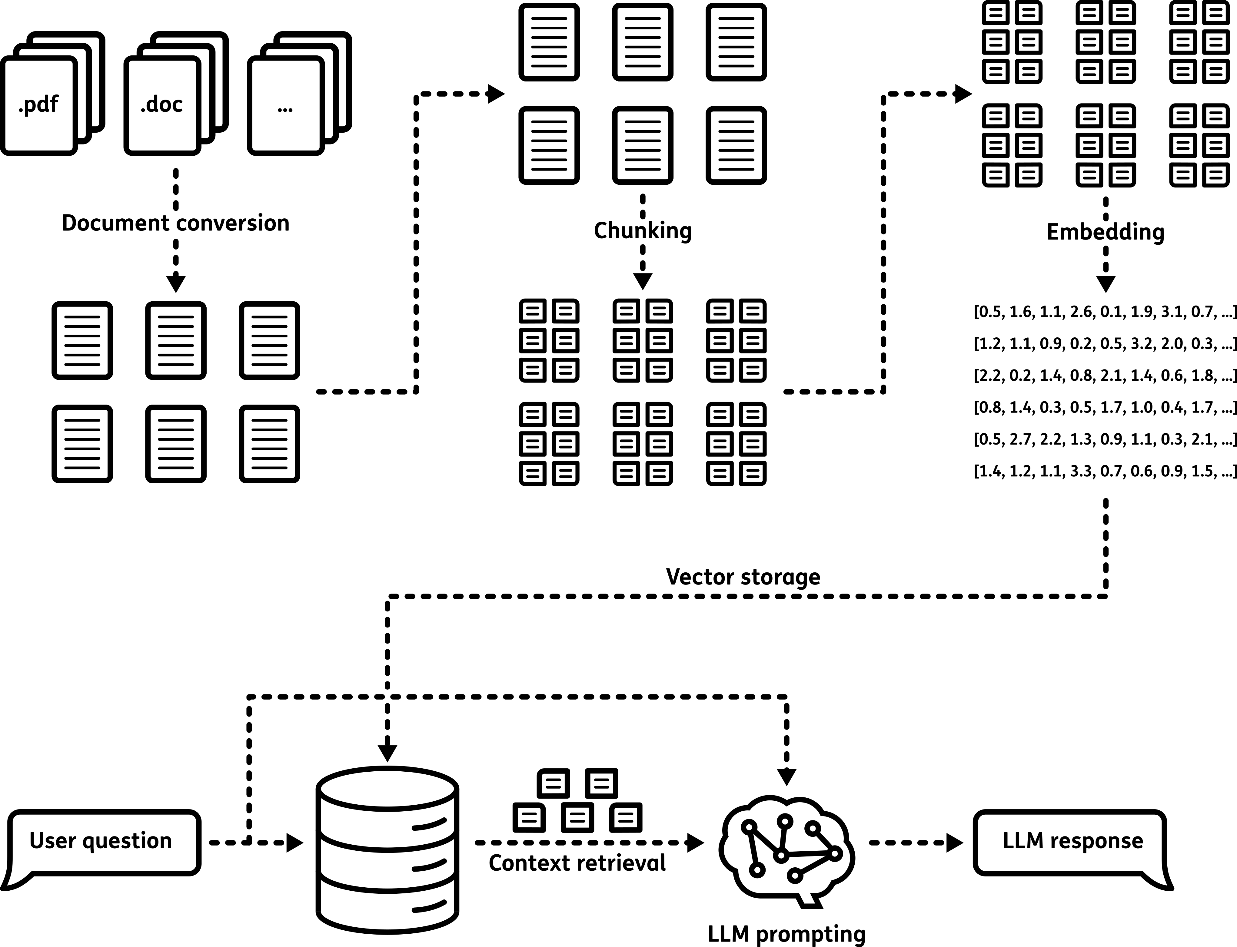 The question is also converted into a numerical vector and compared to all embeddings of text extracted from the reports. A set of the most relevant chunks is selected. The selection of embeddings is a selection of parts of the text and will be the context for answering the question.
