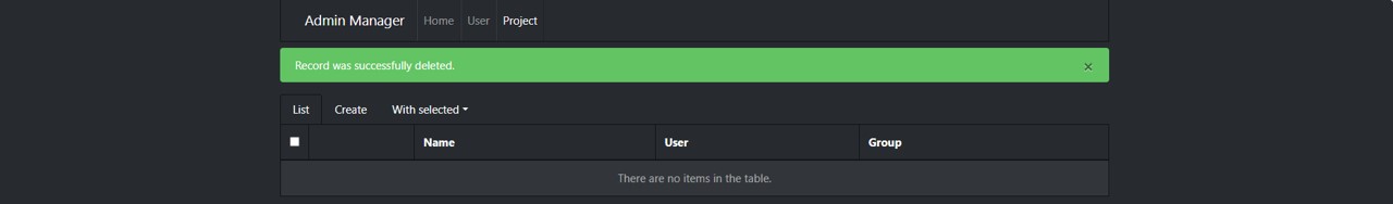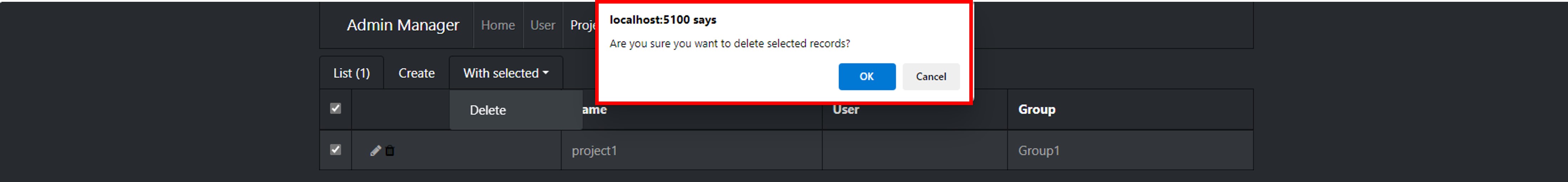 Navigate to the Admin Manager page. Under the “Project” option, select the “bin” icon or use the “Delete” option from the dropdown menu (“With Selected” option).